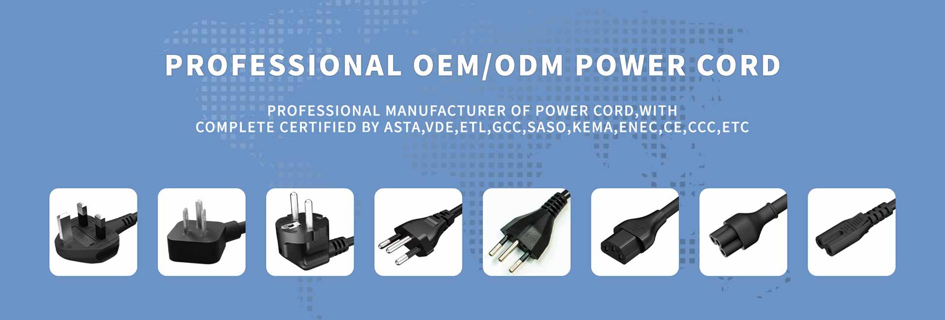 We are a power cord manufacturer, providing diversified power cord solutions, including customized power cords, different plug types and lengths, and high quality products that meet international certifications. We are able to provide OEM/ODM services with fast delivery and mass production capability. Our products are applicable to a wide range of industries such as home appliances, IT equipment, communications, medical and etc., and we provide comprehensive after-sales service and technical support. Through continuous innovation, we ensure to provide customers with high-performance, safe and reliable power cord products!